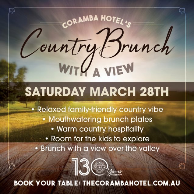 Country Brunch is happening Saturday 28th March at the award winning Coramba Hotel. Bring the family, settle in with great food, warm hospitality and let the kids roam while you soak up the valley views. The perfect excuse to slow down and enjoy the weekend, Coramba style.